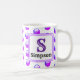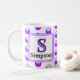 This monogram tea or coffee mug is a great way to add a colourful accent to your morning routine. A bright purple polka dot pattern appears against a white background on both sides of this mug. The letter "S" is featured in a square along with the family name. The letter and your name can quickly and easily be personalised.