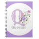 Gift for someone with a name beginning with Q. Design features the recipient's Monogram & Name with Flowers either side in a water colour pastel style. Initial is the letter Q. Example is a gift notebook for Queenie.