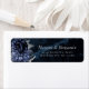 This wedding invitation return address label features a bouquet of navy blue flowers and silver faux foil foliage on a navy blue watercolor agate background. Add your names in silver gray italics script and your address in serif font.