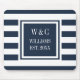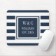 Elegant personalised initials monogram mouse pad featuring a navy blue and white striped pattern with your initials and family name with your established date set in a navy blue-bordered square with a classic white text. Designed by Thisisnotme©