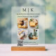 Modern Minimalist Business Plaque Tabletop Acrylic Sign with 4 Photos. Black & White or choose your custom colours. Add your website or social media web address to the QR Scan Code. Allow customers to use the scan to access information on your items such as products or menu items. Perfect for retail companies, small business shops, mall kiosks, trade show and event booths, hospitality, salons, spas, bakeries, cafes, restaurants, bars and more. Easy to personalise with your monogram initials, business name and information, photos, slogan or even add your logo or personal brand design.
