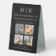 Modern Minimalist Business Table Tent Sign with 3 Photos. Black & White or choose your custom colours. Add your website or social media web address to the QR Scan Code. Allow customers to use the scan to access information on your items such as products or menu items. Perfect for retail companies, small business shops, mall kiosks, trade show and event booths, hospitality, salons, spas, bakeries, cafes, restaurants, bars and more. Easy to personalise with your monogram initials, business name and information, photos, slogan or even add your logo or personal brand design.