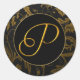 Black and gold Monogram seals with a beautiful scrolling script text art on elegant floral damask. These stickers add a unique touch of class to your wedding invitations!