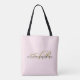 Elegant refined feminine chic all over print tote bag, personalizable customisable with monogram, initial letters and name. Soft stylish pastel blush pink background, elegant gold calligraphy script handwritten initial letters, and classy black typography for the name. Beautiful and timeless, for you or as a thoughtful custom gift for her. Useful fashionable accessory and very affordable, a gift under 50 dollars, even under 30 dollars.