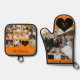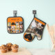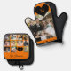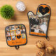 Add 12 family, kids, pets, or best friends photos and create your own trendy collage grid black and orange funny cute kitchen oven mitt and pot holder set with your personal or family monogram name and initial inside white hearts. +++++++++++ Easy to personalise with your custom square images, text and letters. It can be a nice thoughtful keepsake gift for a family member, friend, or coworker on a birthday, anniversary, Christmas, or any other occasion.