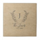 Custom laurel monogrammed family name and established year elegant chic rustic country farmhouse style ochre beige burlap template tile. +++++++ A modern keepsake gift or kitchen decor for weddings, anniversaries, housewarmings, Thanksgiving, Christmas, or any other occasion.