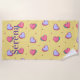 This fun candy heart design features pink, and purple purple hearts on a yellow background.