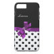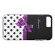 Custom monogram smartphone cases with fun black and white polka dots pattern, beautiful purple digitally printed simulated bow, and monogram name drop you can personalise with your name or monogram initials to make your own. Designed for ladies, or girls who want to add some character and style to their cellphone.