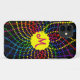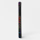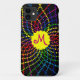 This monogrammed iPhone 5 case has a black background with a bright and colourful purple, pink, red, orange, yellow, green, and blue rainbow polka dots pattern flower petal shape on it. Personalise the decorative yellow centre with your name, initial, monogram or other text.