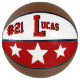 This is a full size basketball with two panels designed with a monogram name (large first letter) and uniform number, in popular college colours. This one is shown in Cardinal Red and White. The second panel has team colours with three stars. All text, art, and colours can be removed, or changed as desired. One panel can be left white for autographs, etc.