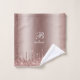 An elegant white script monogram on a rose gold glitter drips bath towel set with bath towel, wash cloth and hand towel. For your modern unique bath decor. Add your name and initial.