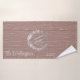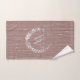 On this trendy towel set is a mauve rustic wood with a letter that you can customise in the centre joined with an elegant silver laurel wreath for extra pop then below that is an area where you can customise it with your name and date. Rustic elegant vibes.