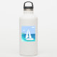 A sailboat (a yacht) with your name on it approaching a beach. Sunny day by the ocean. Tropical sea view. A shore with green palm trees. Blue, teal, sea foam, turquoise, green, white. Very dresh and modern.