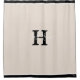 Beige, black and white shower curtain with last name and initial with a black border and black initial. Background can be any colour, as can font. from HAMbyWhite Glove aka HAMbWG