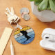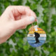 This unique keychain features a black silhouette downhill snow skier which is placed on a retro style circle rainbow background of distressed stripes. The image is placed off center, with your triple letter monogram at the side. The back is also black, with two fields for your custom text.