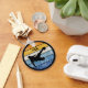 This unique keychain features a black silhouette soccer player which is placed on a retro style circle rainbow background of distressed stripes. The image is placed off center, with your triple letter monogram at the right side. The image is bordered in black. The back is also black, with two fields for your custom text.