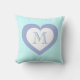 This pillow features a white and sky blue heart containing a monogram initial on one side, and a sky blue heart pattern on the other. Click "Customise it!" to re-size/re-position sky blue hearts, change background colour, and/or personalise text.
