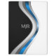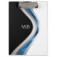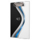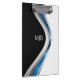 A sleek clipboard design for the modern professional featuring a metallic curves pattern in blue, silver and grey in a curved shape with a black and white background. Personalise the sample text shown in the design template with your monogram, name, logo or other desired text.