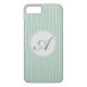 Dress up and protect your iphone with a modern striped pattern in teal and off white colours with a round circle design element that is custom monogrammed with your initial in a stylish Script font.