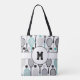 Sporty monogram tennis tote bag featuring a stylish pattern of tennis rackets and balls in black, grey, and teal. Perfect for tennis players, coaches, and fans to carry gear, snacks, or personal items to matches, practice, or tournaments. Customise with your initial or name for a personal touch. Makes a thoughtful gift for birthdays, team celebrations, or tennis-loving friends. Durable and versatile for both on and off the court.