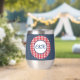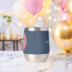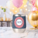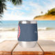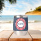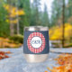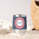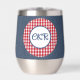 This modern 11 oz. stainless-steel thermal tumbler features a medium blue denim wrap with framed script initials on a red & white buffalo check circle pattern. Simple white script phrase is on the back. Change or remove initials and text using the Template provided. Double walled insulation for temperature retention. Stainless Steel construction for durability. The clear lid is leak-proof. Excellent printing and high reviews. See "About This Product" at side for more information.