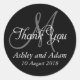 Monogram Stickers for Weddings. This elegant, simple design is perfect for wedding favours and thank you cards. Elke Clarke ©2011. The words "thank you" in a white script font, bride and groom names and wedding date in white text, grey monogram or initial design on a black background. For other colours contact luxuryweddinginvitations@gmail.com