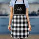 This monogram apron features a white and black buffalo plaid pattern with solid black at the top where your grey initial and white name can be added.