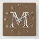 Monogram White Script Numbers On Brown wccnt Square Wall Clock