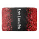 Step into comfort and style with our luxurious monogram bath mat. This elegant bath mat features the heartfelt message "Love Lives Here" in a pristine white text, creating a striking contrast against a bold black background. The top and bottom edges are beautifully adorned with a shimmering red glitter border, adding a touch of glamour and sophistication to your bathroom decor.