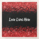 Add a touch of elegance to your table setting with our stunning monogram glass coaster set. Each coaster in this exquisite set features the heartfelt message "Love Lives Here" in white text, beautifully contrasting against a bold black background. The top and bottom edges are adorned with a shimmering red glitter border, adding a hint of glamour and sophistication to your home decor.
