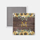 Add rustic charm to your space with this elegant brown wood magnet, featuring yellow sunflowers, eucalyptus leaves, and a custom monogram—a great summer floral accent or wedding gift!