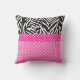 Girly monogrammed black and white zebra with hot pink and white polka dot pattern pillow. The design features a black and white zebra pattern and small white polka dots on hot pink. In the middle there is a hot pink circle with your custom initial.