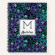 Monogrammed 90s Glow Floral Pattern Trendy Flowers Journal. Many paper styles. Purple and green flowers in a retro 90s pattern on black background. Monogram and personalised in black font on a white square. www.SamAnnDesigns.com