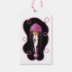 Retro vintage favour tag featuring a golden umbrella lady emblazoned with amethyst gemstones specifically for april birthdays or bridal showers etc.