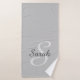 Beautifully designed monogram initial and name combination to be personalized on a high quality polyester and cotton bath towel. Large light gray initial and charcoal name on brilliant medium toned gray background. Design in the bottom 1/3 of towel for esthetic appeal. Will add a personal touch to your bathroom. A great housewarming, birthday or Mother's Day gift for someone special.