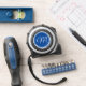 Design features a bright-blue background to the initial you supply, displayed in a decorative, white font. Design is encircled by a blue and white border.