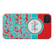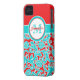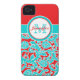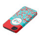This modern, personalised, turquoise blue, red, and white floral damask pattern Case-Mate Barely There™ iPhone 4 Case has spots for you to add your name, initials, monogram, or other text. If you need help customising this, please email niteowlstudio@gmail.com.