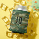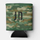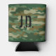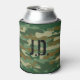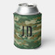 Monogrammed can cooler with army camouflage design. Hunting / military camo print with custom monogram initial letters on front and back. Double sided pattern personalised with name, letters or quote. Hunter green and black. Masculine gift idea for manly men; dad, father, uncle, son, grandpa etc. Vintage typography.