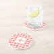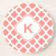 Coral pink quatrefoil design with monogram sandstone coaster. Pink quatrefoil patern on white.
