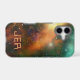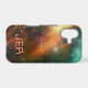Custom monogrammed initials are featured in space aged looking galactic style font in coordinating orange on a cosmic universe background! Uniquely perfect for anyone who loves the night sky, science or space!