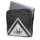 This modern laptop sleeve for men features a geometric design with a customisable name and monogram in a white marble and silver frame on black background.