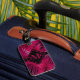 Tropical hot pink palm fronds on black, these luggage tags feature your monogram in chic lettering on the front and a card slot on the back for easy identification. Create for yourself or give as a gift.