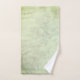 An elegant monogrammed sage green towel set with white initials. A subdued mottled light texture effect. A perfect style accent colour for an earthy neutral spa vibe bathroom.