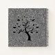 Modern styling of a leafy oak tree silhouette with your monogram in white on the trunk sitting against a silvery grey and white paisley pattern.