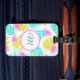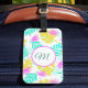 A Tropical Luggage Tag Design In Pastel, Blue, Yellow And Pink Palm Leaves On White You Can Monogramme