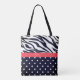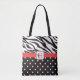 This custom all-over-print tote bag features a mixture of both zebra and polka dot patterns. In the centre, there is a red and black monogram that you can personalise using the custom template.
