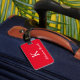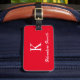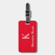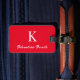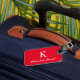 Monogrammed initial s with custom text "Adventure Awaits" and also personal details like name, address, phone number and email all of which you can edit. Designed with red background and white text, you can change the colour if you wish.