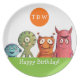 Make your child's next birthday bash special with this cute personalised plate that features a whimsical, children's book style illustration of colourful monsters. Ready to personalise with your child's monogram/initials and Happy Birthday text, or text of your choice.