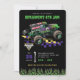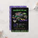 This high-energy Monster Jam–inspired design features the iconic Grave Digger monster truck racing across a bold black background with neon green flames, purple accents, and a dynamic checkered flag pattern. The powerful truck illustration is front and center, creating an action-packed look that feels fast, loud, and exciting. Bright green lettering and vivid purple details add to the adrenaline-filled theme, making this design perfect for kids who love monster trucks and thrilling races. Personalized event details like the name, age, date, time, and location are clearly displayed, making the design both fun and functional for a memorable monster truck–themed birthday celebration.