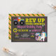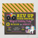 The playful headline “Rev up your engines for a magical birthday party” sets an exciting and cheerful tone that both kids and parents will love. The chalkboard-style background, bright accents, and clean open layout make this invitation easy to customize with names, ages, date, time, and party details.